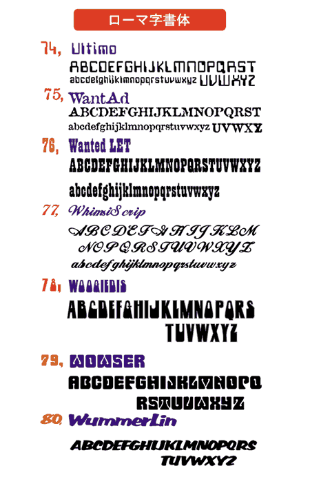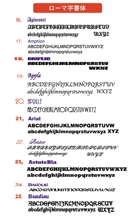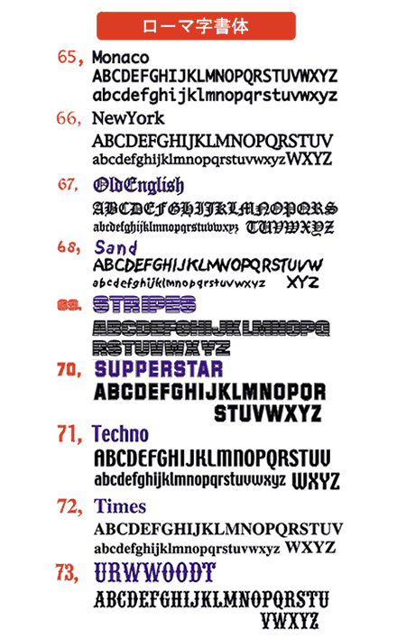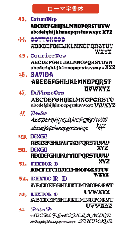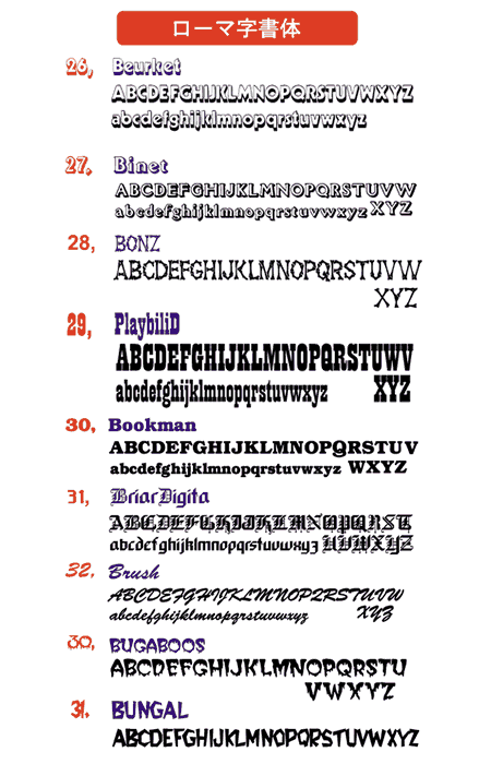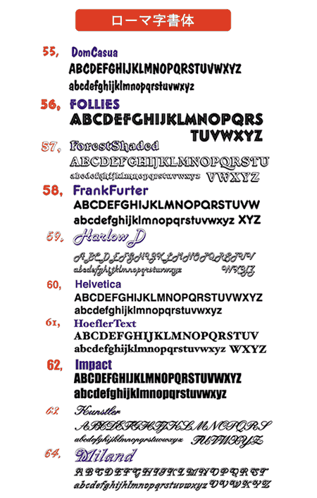オリジナルロゴやデザインが無い場合、下記の書体リストよりお好みの書体をお選びください。(イラストや写真との組み合わせも可能です)